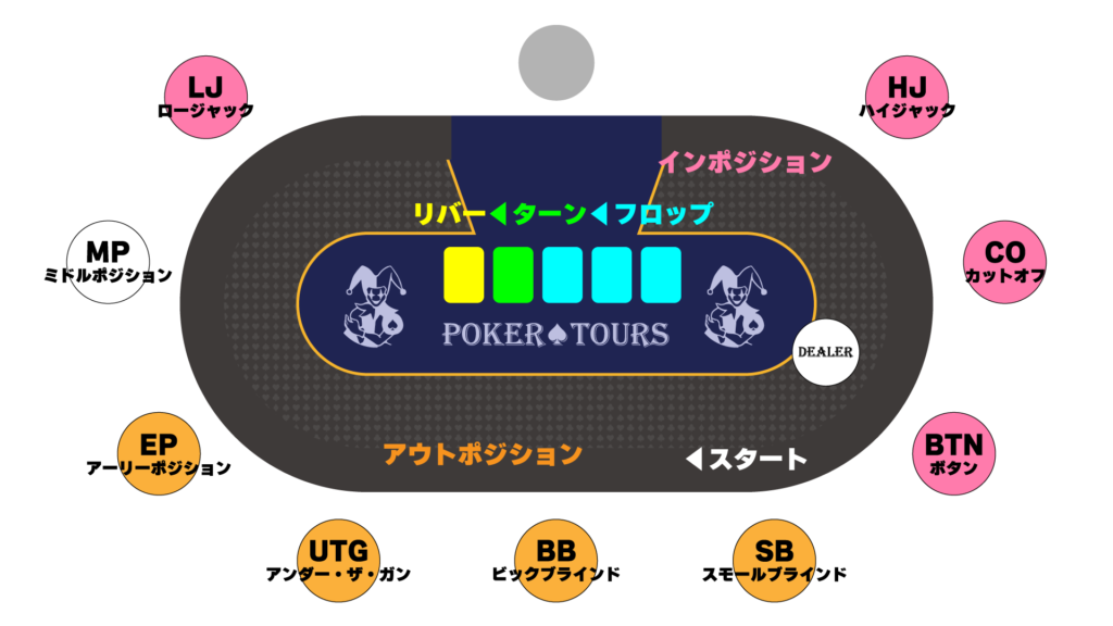ポーカーでは、最後にアクションをするBTNが一番有利ですが、BTNに近いポジションをインポジションと呼び、逆にSBに近いポジションをアウトポジションと呼びます。